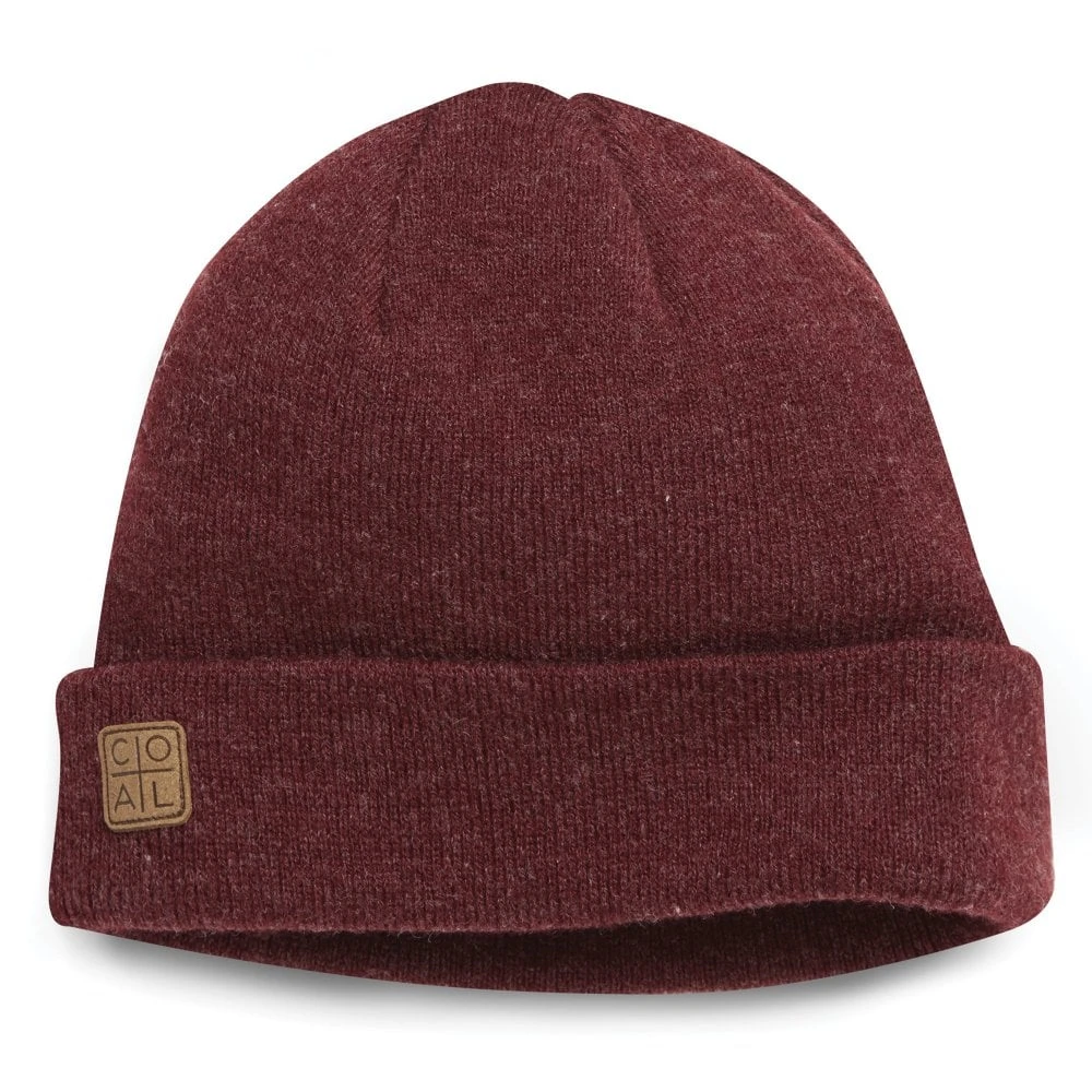 Low profile fine rib knit beanie with leather Coal patch on cuff.