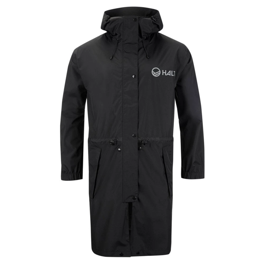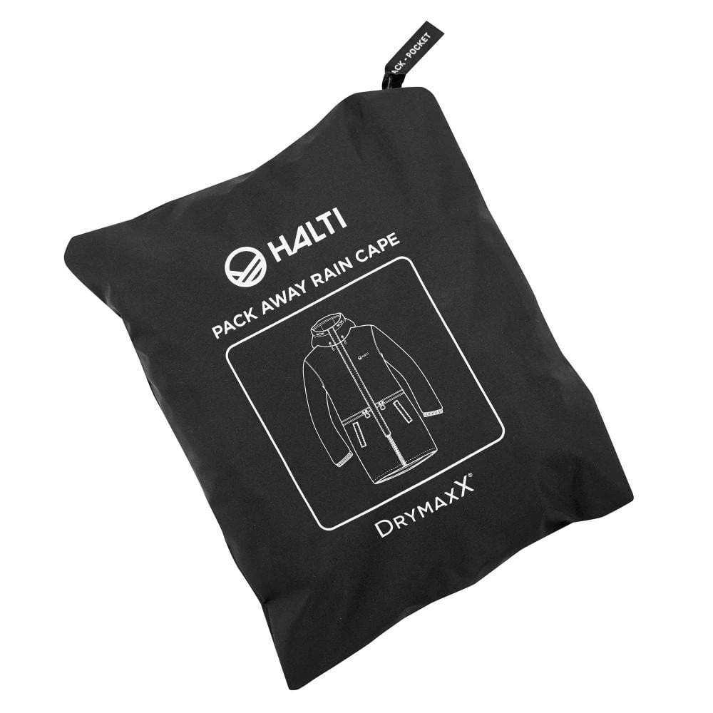 Halti Club collection versatile Pack-away skiers rain cape. Long protective jacket with waterproof and breathable DrymaxX Classic fabric. Functional pocket on right side. This coat is suitable for ski coaches.