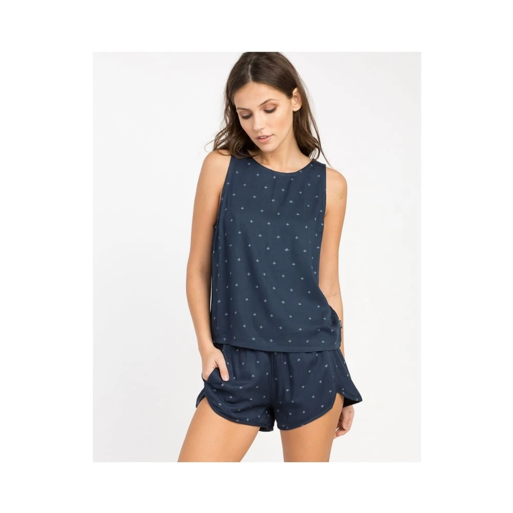 The RVCA Shieldless Tank Top is a woven shell tank top with a high neckline and an allover print. It has a zipper at the center back for easy on and off.