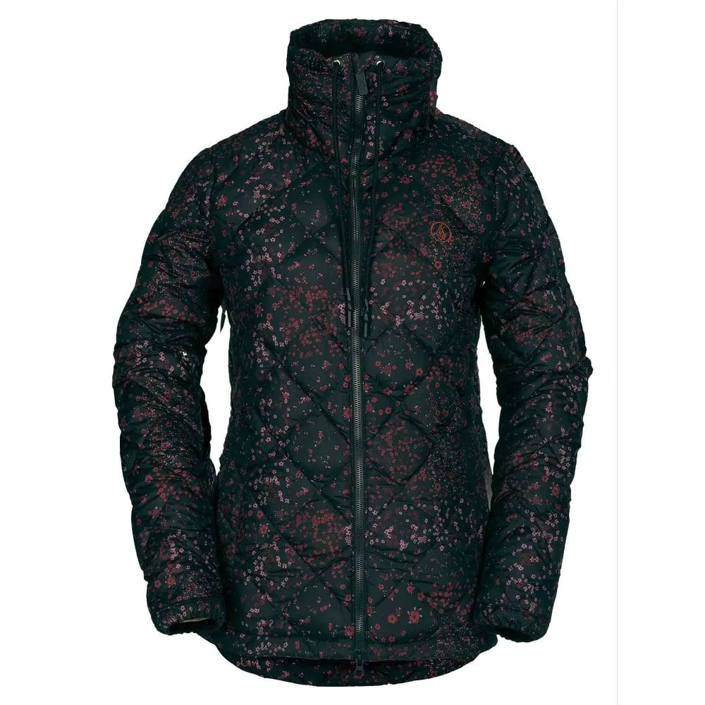 Jacket with floral print for women made of polyester and lining and filling in polyester and down with 600 fill power insulation, v-science fabric in waterproof taffeta, laces to adjust the high collar with suede chin strap, waterproof zip closure ykk® with whistle handle, elastic cuffs, zippered pockets with knit lining and access to the drawstring hem, rounded bottom hem and embroidered logo on the chest.